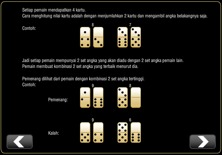 • Pemenang Permainan Domino KIU-KIU akan di lihat dari nilai kombinasi 2 pasang kartu yang tertinggi.
